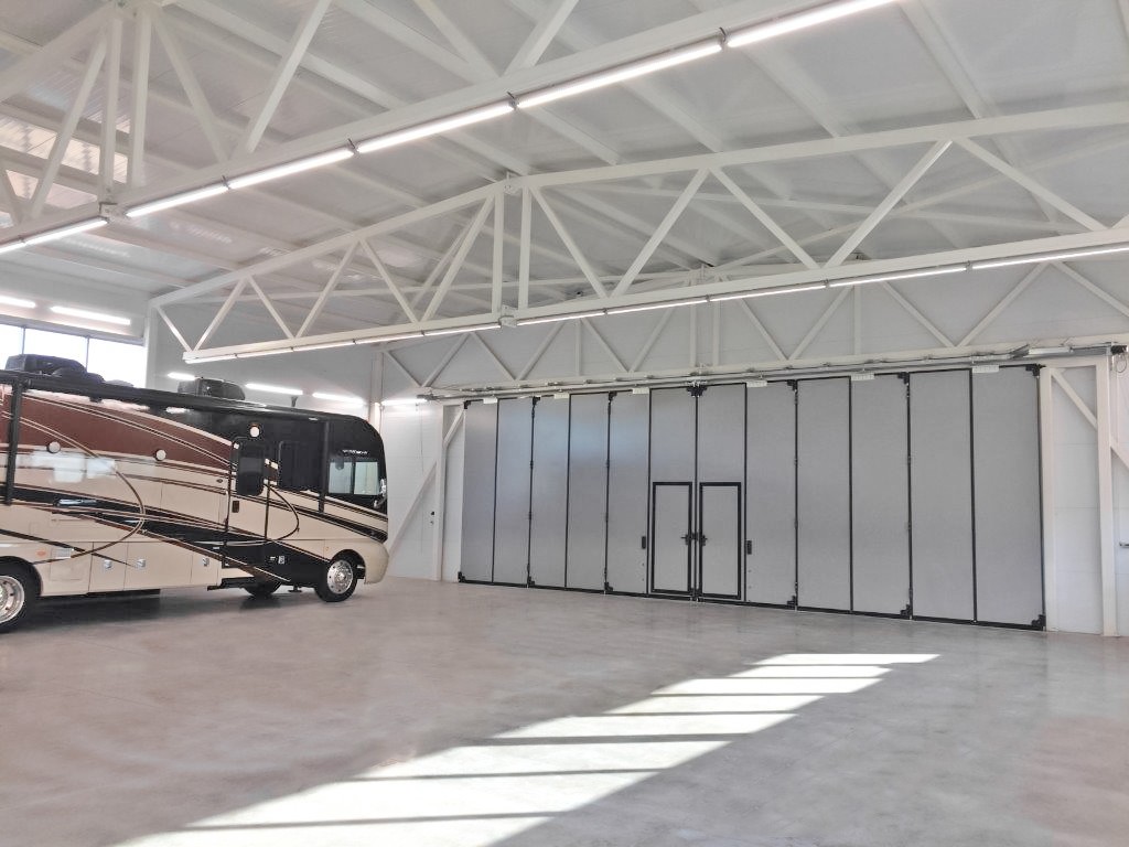 I nostri portoni a libro DoorHan sono la soluzione ideale per tamponare grandi aperture industriali dove i portoni sezionali non sono praticabili. Pannelli coibentati da 50-52mm in doppia lamiera zincata, disponibili in quattro configurazioni: senza guida a terra, con guida a pavimento, scorrevoli e vetrati per showroom. Colori RAL standard o finiture simil-legno, guarnizioni EPDM antinvecchiamento e accessori personalizzabili. Installazione professionale a Cagliari e in tutta la Sardegna.