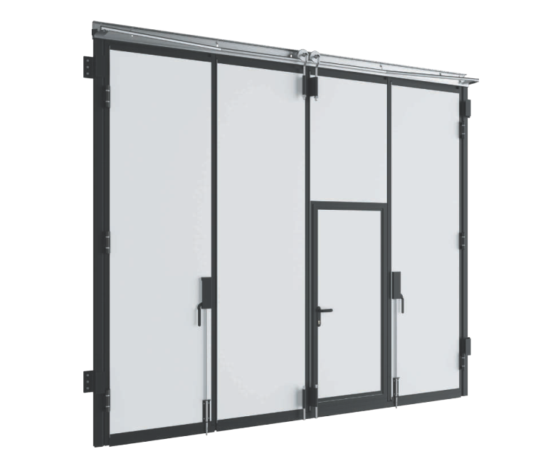 Portoni a libro DoorHan composti da pannelli in doppia lamiera zincata preverniciata con schiuma poliuretanica iniettata, spessore totale 52mm. Il telaio interno in acciaio zincato garantisce il fissaggio robusto delle cerniere. Tipologia classica 2+2 ante (due per lato), fino a un massimo di 4 ante per lato. Applicazione interna o esterna. Guarnizioni laterali EPDM antinvecchiamento. Ideali dove non è possibile realizzare una guida a pavimento o per esigenze di massimo transito a raso. Disponibili con porta pedonale inserita, oblò e griglie di aerazione.