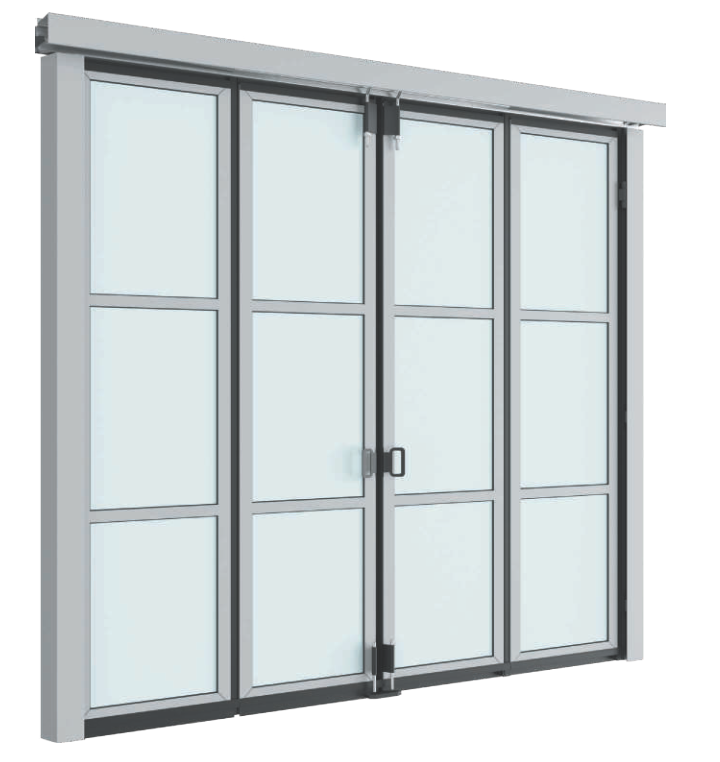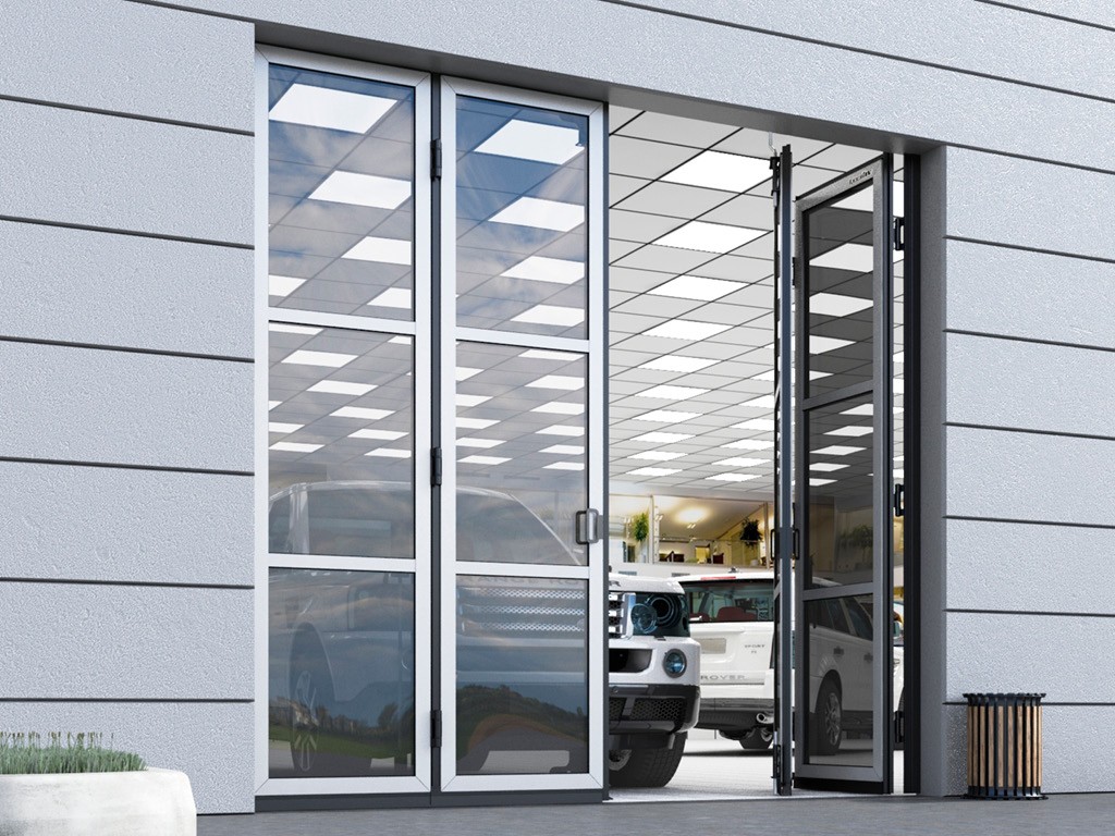 Portoni a libro vetrati DoorHan con ante spessore 50mm realizzate in profili perimetrali in acciaio verniciato. Le ante possono essere suddivise con traversi orizzontali e le specchiature sono tamponate da vetri installati in opera. Disponibili con o senza guida a pavimento, configurazione standard 2+2 fino a 4 ante per lato. Guarnizioni laterali EPDM anti-invecchiamento con protezione antipizzicamento. Ampia scelta di colori RAL. Perfetti per showroom, concessionarie e ambienti espositivi che richiedono massima luminosità e visibilità del prodotto esposto.
