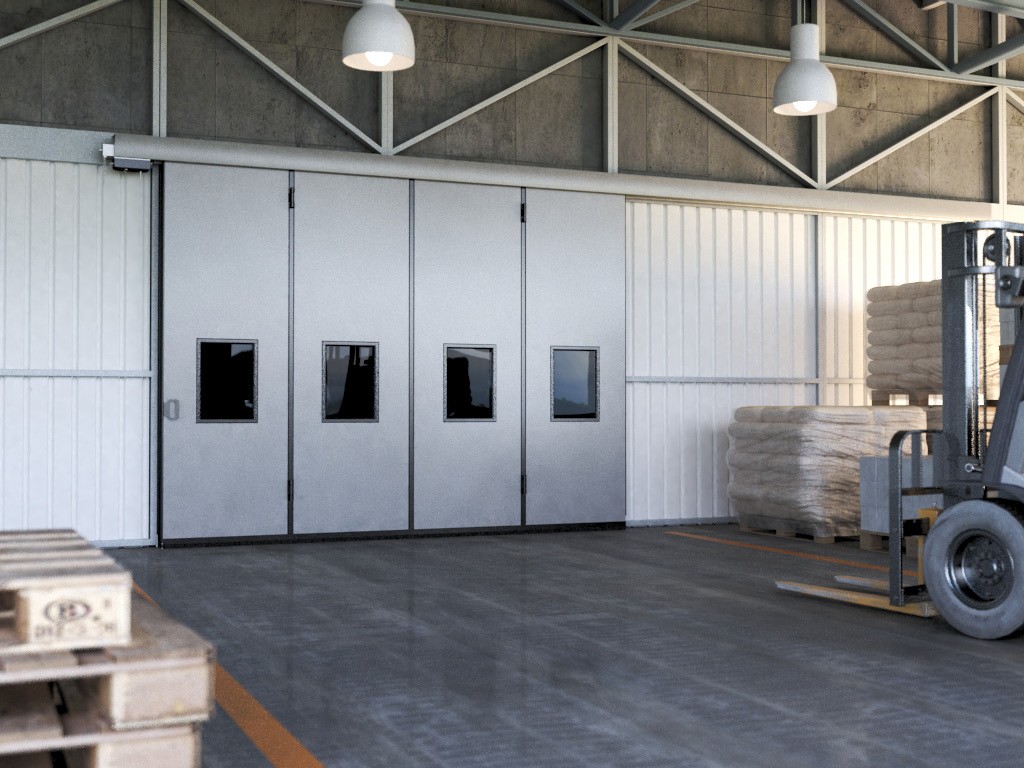 Portoni a libro DoorHan con guida a pavimento idonea allo scorrimento dei cuscinetti inferiori, pensati per tamponare fori di grandi dimensioni. Movimentazione manuale o motorizzata (catena 380V o pignone/cremagliera 240V), apertura da singolo lato o centrale bilaterale. Disponibili con 1-3 ante per lato. Profilo in alluminio inferiore con spazzola in nylon che si adatta alle imperfezioni del pavimento. Applicazione interna o esterna, ampia scelta di colori RAL e finiture legno chiaro. Soluzione robusta e silenziosa per capannoni industriali e logistica.